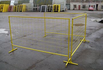 Непостоянные ограды в виде металлических секций состоят из опоры и рамки с натянутой сварной сеткой. Рама и опора выполнены из профтрубы сечением 20 или 25 мм. По обеим сторонам секции приварены зацепы и проушины, с помощью которых элементы ограды фиксируют между собой. Замковое соединение позволяет прочно крепить секции друг к другу.